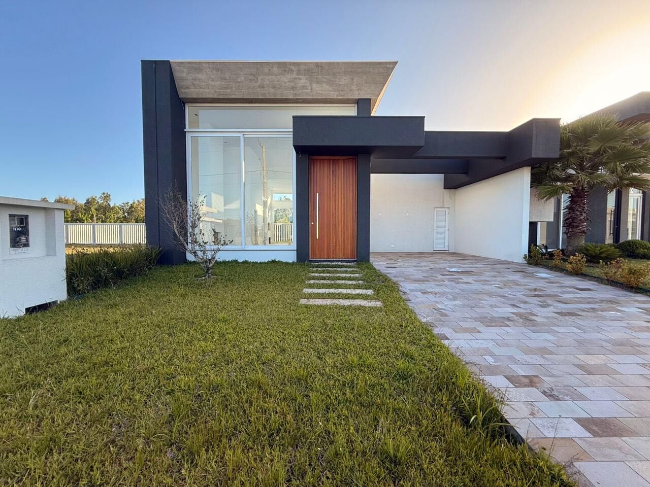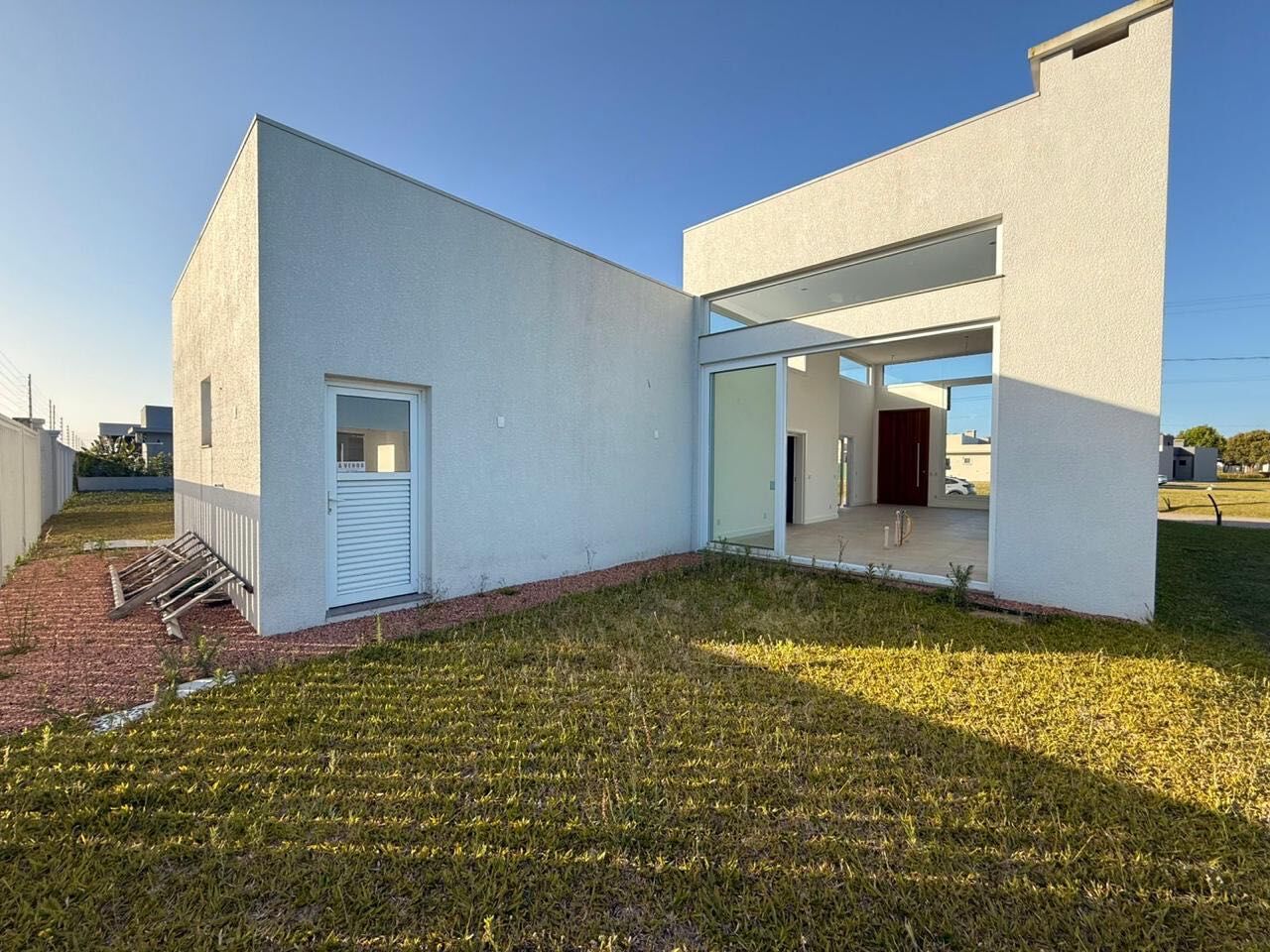 Casa com 3 suítes independentes, lavabo com ventilação externa, esperas para: chopeira, churrasqueira rotativa, bifeteira à gás, energia fotovoltaica, espera para split em todos ambientes. Espera para energia carregamento veículos elétricos. Esquadrias externas em PVC branco. Porta principal pivotante 1,60m x 3,40m. Sala estar e jantar integrados com pé direito 5,10m. Cozinha com pé direito 4,30m. Suites, banheiros, corredor interno, lavabo e rouparia, com pé direito 2,85m. Cozinha, banheiros, lavanderia e lavabo, tudo com água quente. Pátio com espera para SPA com água quente. Vaga para 2 carros. Casa com aterro 80cm acima do nível da rua. Piso e azulejos PORTOBELLO. Registros hidráulicos - DECA. Tintas - SUVINIL. Canos, conexões hidráulicas e esgoto AMANCO. Caixa d'água 1.000 litros - TIGRE. Eletrodutos e caixas tomadas - TRAMONTINA. Aço GERDAU. Telhas 6mm. Clarabóias nas salas de estar, jantar, e na cozinha, para aproveitamento da luz solar. Projeto aprovado 149m². Área construída 220m².