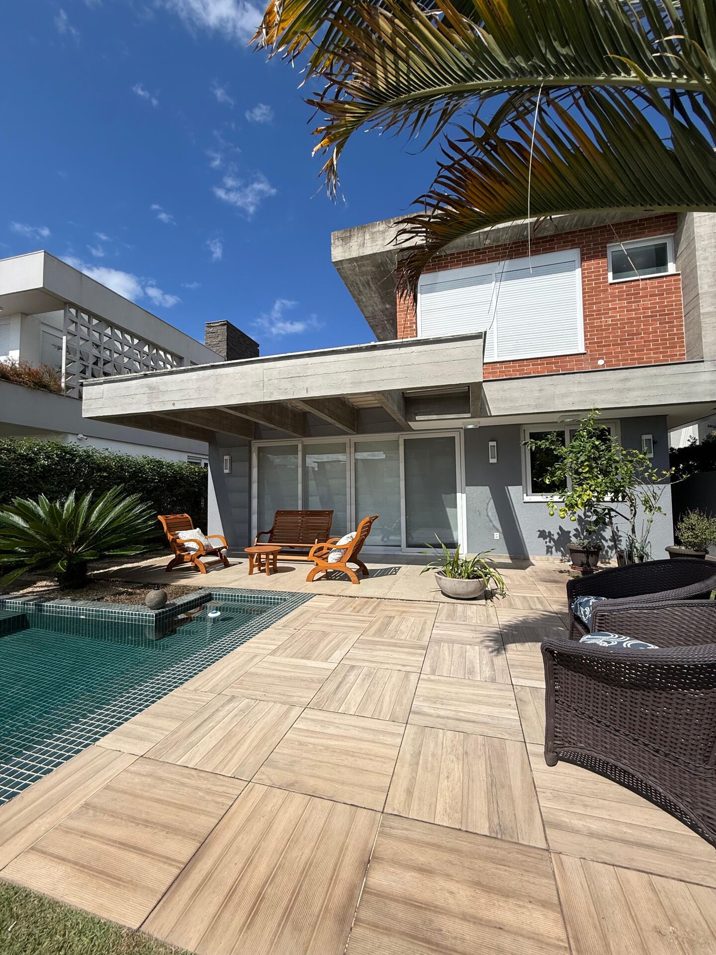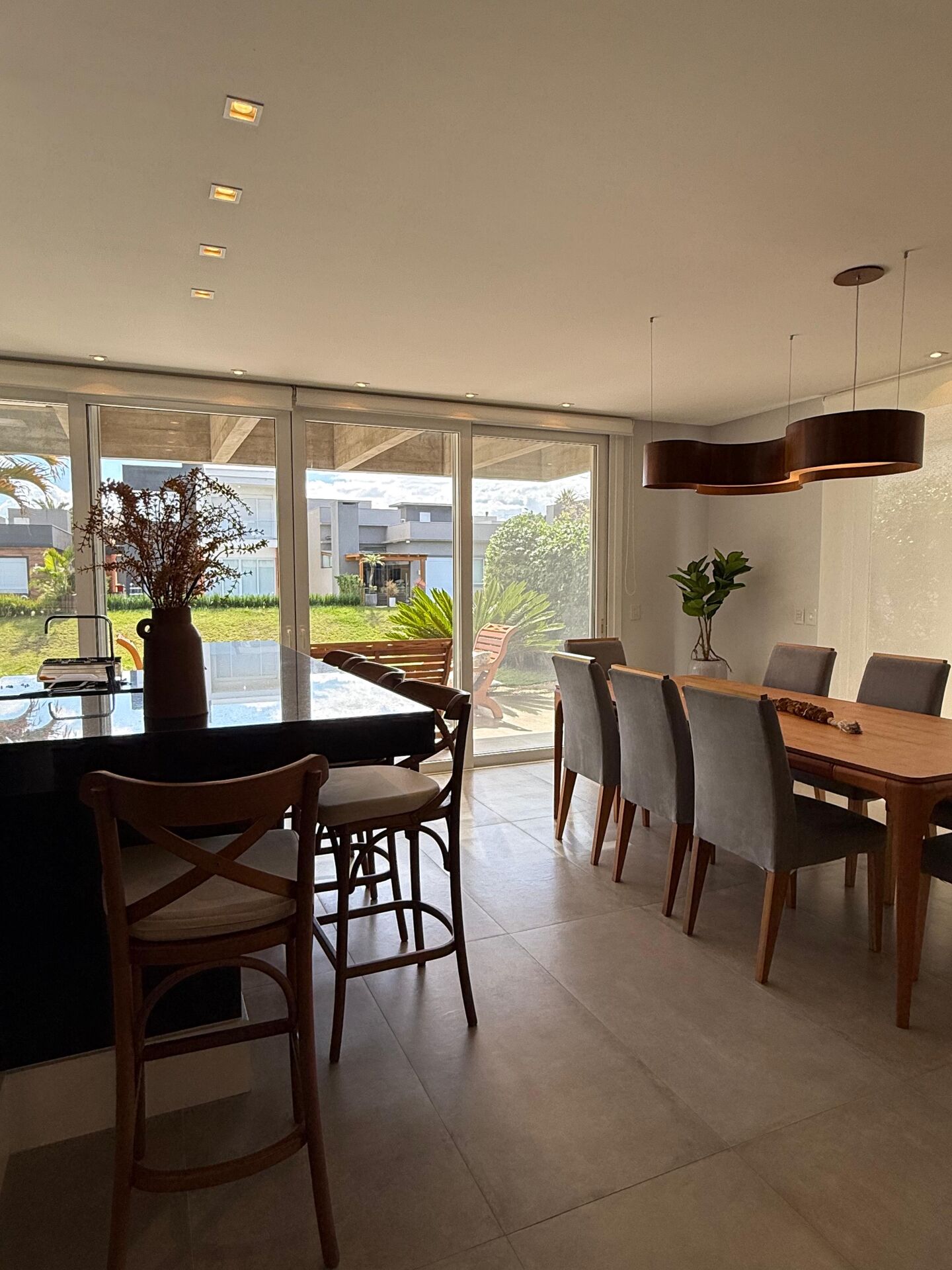 Sobrado mobiliado, beira lago, com piscina, 4 suítes, sendo 3 na parte superior com 2 master com terraço, lareira, uma no andar térreo, living, jantar e estar com lareira, 289m² de área privativa.